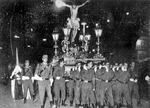 El primero de los pasos de la cofradía (en la imagen) lo talló José María Hervás Benet en 1955 y constaba de un canasto tallado y dorado. Era iluminado en las esquinas por cuatro faroles y junto al crucificado aparecían dos arcángeles ceroferarios. Fue concebido para ser portado a hombros por lo que contaba con tres varales por delante y tres por detrás para ser portado por 24 personas. En la década de los setenta la Cofradía deja de salir y en 1979 cede este paso a la Hermandad del Prendimiento, saliendo en él Nuestro Padre Jesús Cautivo de Medinaceli que lo hace, curiosamente, con una disposición diferente de los ángeles. Estos mismos ángeles también saldrían, a mediados de los ochenta, en el paso de la Borriquita.